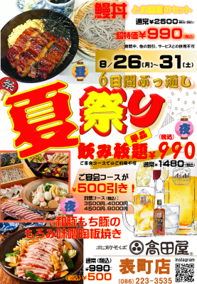 2024.08.25 【高田屋岡山表町店】夏イベント”ふたたび”のお知らせ いつも高田屋岡山表町店をご利用いただき誠にありがとうございます。 まだまだ暑い日が続きますが、高田屋表町店も まだまだイベント続けます! 今回はランチに鰻丼も超得で登場。 是非お越しくださいませ。 ※こちらは高田屋表町店のみのイベントです。