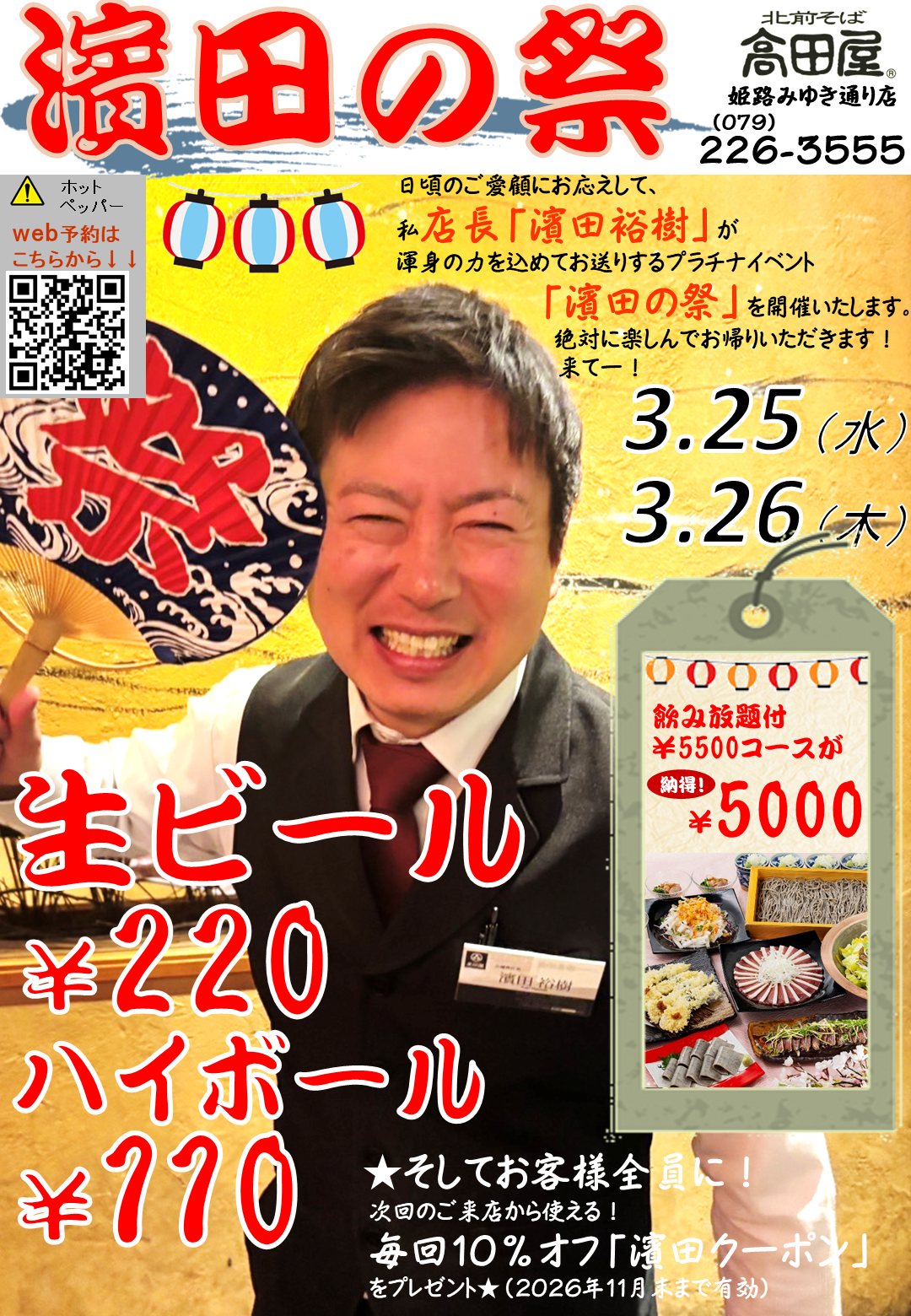 2026.03.01 【高田屋 姫路みゆき通り店】生ビール¥220!大特価「濱田の祭」開催 来る3月25日、26日は 高田屋姫路みゆき通り店に集合! 生ビール¥220、ハイボール¥110 など お得なイベントを開催します。 是非お越しくださいませ。